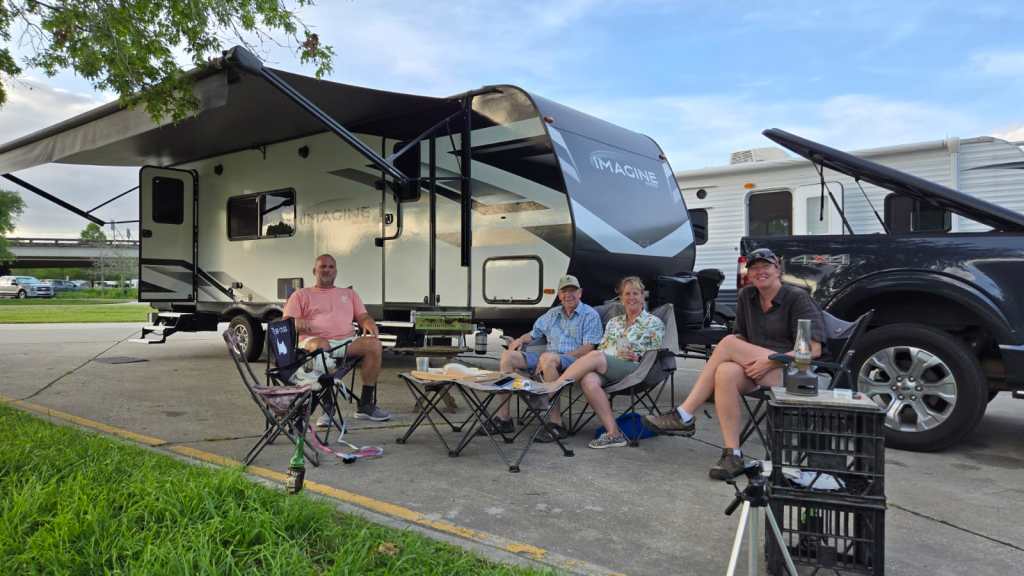 We took two days to get from Alabama to the Bolivar Peninsula, mostly on the Interstate-10, and stopped overnight at the Atchafalaya Welcome Center in Louisiana. By pure coincidence, Betty and Doug (friends we had met down in the Florida Keys) were heading the same way. They had passed our campsite at Meaher State Park on the morning of March 30th as they were heading from Florida through to Texas (also for the solar eclipse). So we met up and boondocked with them at the welcome center on the Atchafalaya Basin for the night. Great to see Betty and Doug, and a great spot for a free overnighter in the middle of the elevated Atchafalaya Basin Bridge!