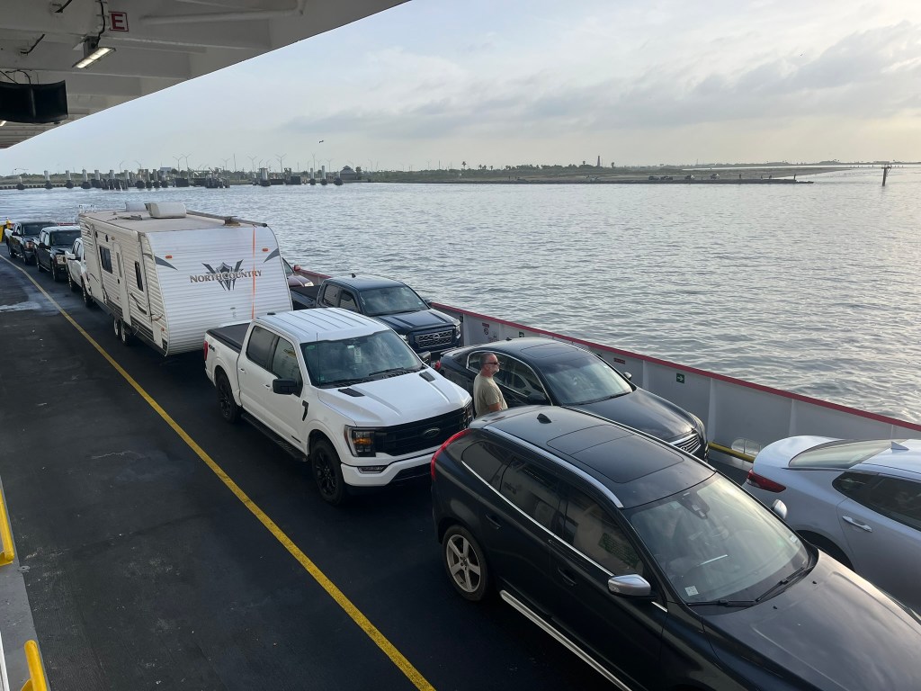 Leaving the Bolivar Peninsula we took the free car ferry to Galveston with the trailer in tow! Very weird to have your house float on a boat across the sea!