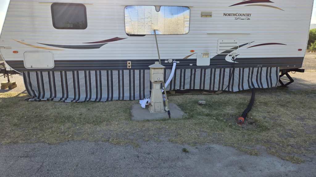 The heat was pretty intense during the day in this part of the world and it was the first time in our trailer travels that we had trouble with the breaker on the main electrical line flicking off – it was too hot! Justin got creative with some towels and an old piece of fabric he found in the dumpster to make a skirt for the trailer and try to keep the facilities out of the sun.