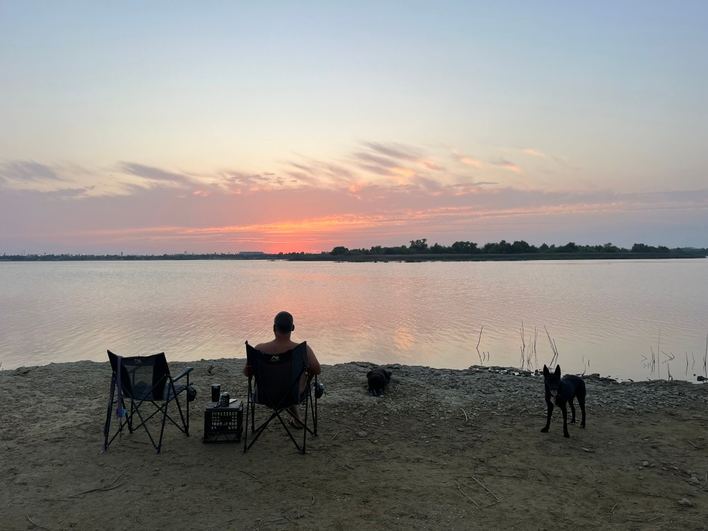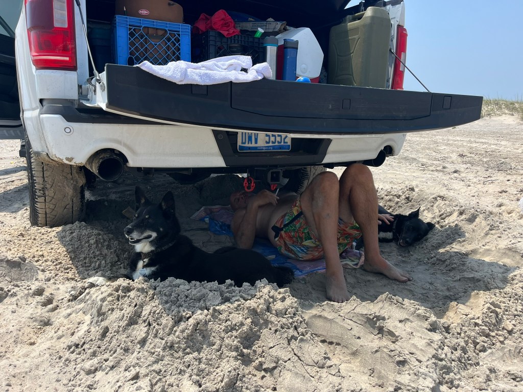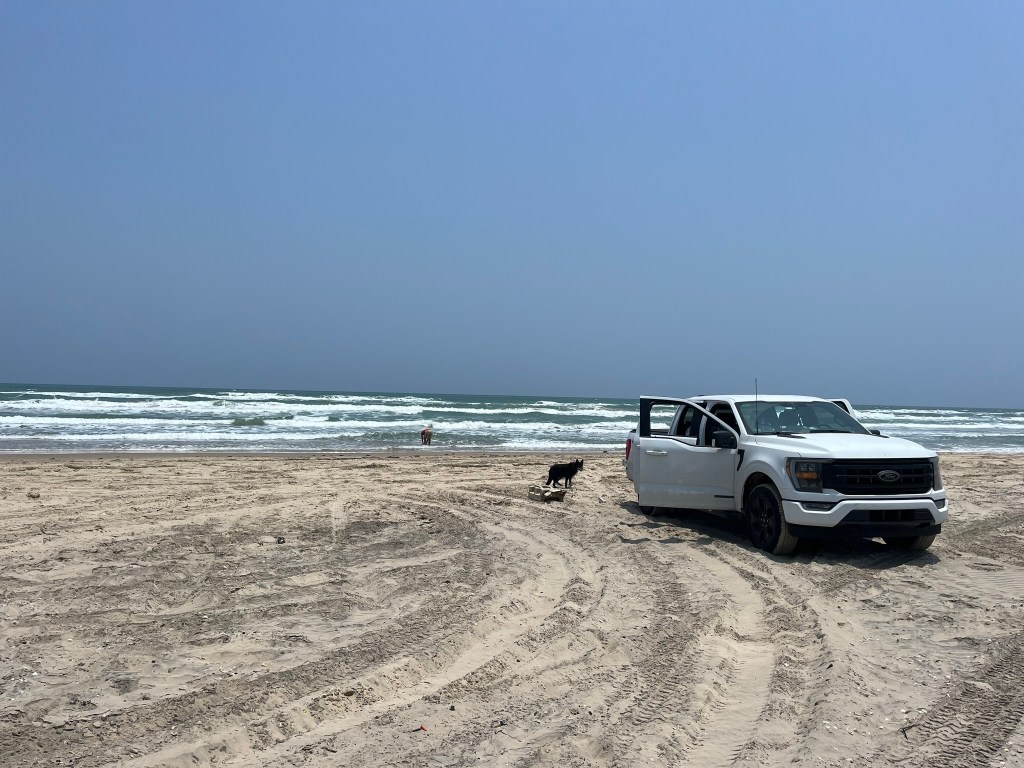 The beaches in Texas have two things going for them: you can take your dogs, and you can drive your car / truck / RV and setup camp with as much stuff as you like! Justin took a drive one day while I was at work and got chatting to a couple of people fishing. They kindly let him reel in the fish – it was a big one!